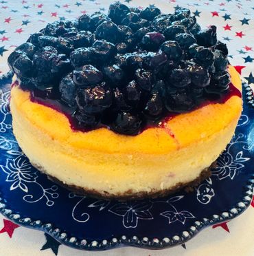 Traditional Cheesecake with a Biscoff ™ Cookie Crust Topped with a homemade Blueberry Compote and Fresh Fresh Blueberries (Pending Blueberry Season)