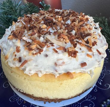 Traditional Cheesecake with a Biscoff ™ Cookie Crust topped with a Homemade decadent toasted coconut topping . For some extra goodness add our homemade Ghirardelli™ Chocolate Sauce as well. Ask us for more details.